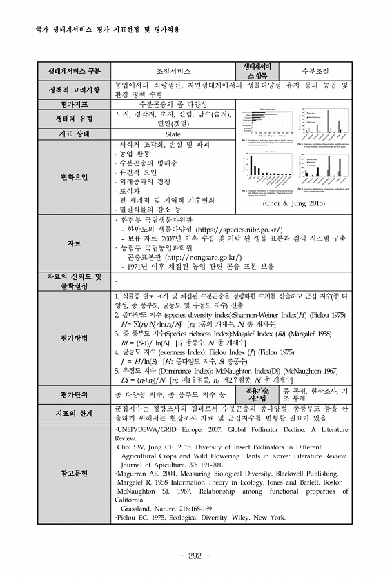 국가 생태계서비스 평가 지표선정 및 평가적용 292 생태계서비스 구분 조절서비스 생태계서비 스 항목 수분조절 정책적 고려사항 농업에서의 식량생산, 자연생태계에서의 생물다양성 유지 등의 농업 및 환경 정책 수행 평가지표 수분곤충의 종 다양성 Choi & Jung 2015 생태계 유형 도시, 경작지, 초지, 산림, 담수 습지 , 연안 갯벌 지표 상태 State 변화요인 · 서식처 조각화, 손실 및 파괴 · 농업 활동 · 수분곤충의 병해충 · 유전적 요인 · 외래종과의 경쟁 · 포식자 · 전 세계적 및 지역적 기후변화 · 밀원식물의 감소 등 자료 · 환경부 국립생물자원관 한반도의 생물다양성 https//species.nibr.go.kr/ 보유 자료2007년 이후 수집 및 기탁 된 생물 표본과 검색 시스템 구축 ·...
