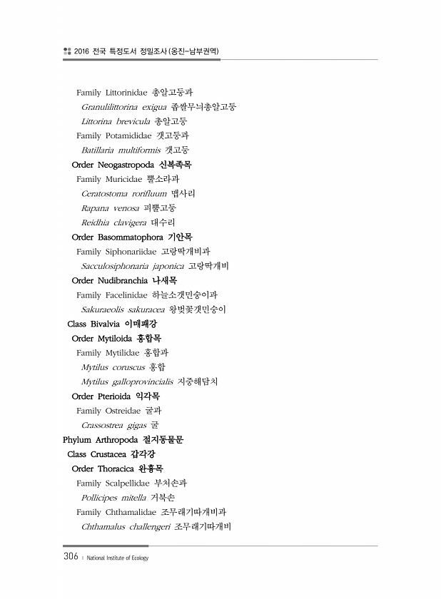 2016 전국 특정도서 정밀조사 옹진-남부권역 306 ? National Institute of Ecology Family Littorinidae 총알고둥과 Granulilittorina exigua 좁쌀무늬총알고둥 Littorina brevicula 총알고둥 Family Potamididae 갯고둥과 Batillaria multiformis 갯고둥 Order Neogastropoda 신복족목 Family Muricidae 뿔소라과 Ceratostoma rorifluum 맵사리 Rapana venosa 피뿔고둥 Reidhia clavigera 대수리 Order Basommatophora 기안목 Family Siphonariidae 고랑딱개비과 Sacculosiphonaria japonica 고랑딱개비 Ord...