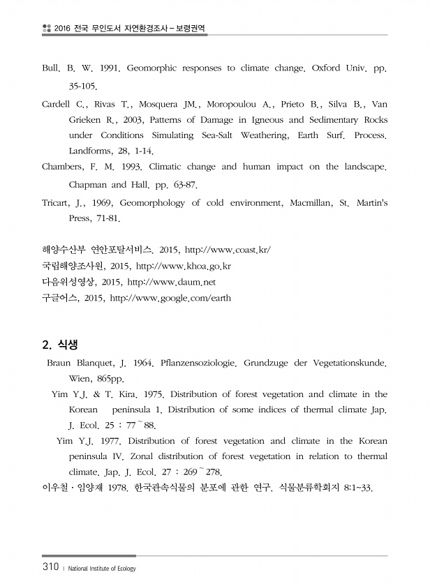 2016 전국 무인도서 자연환경조사 보령권역 310 ? National Institute of Ecology Bull. B. W. 1991. Geomorphic responses to climate change. Oxford Univ. pp. 35-105. Cardell C., Rivas T., Mosquera JM., Moropoulou A., Prieto B., Silva B., Van Grieken R., 2003, Patterns of Damage in Igneous and Sedimentary Rocks under Conditions Simulating Sea-Salt Weathering, Earth Surf. Process. Landforms, 28, 1-14. Chambers, F. M. 199...