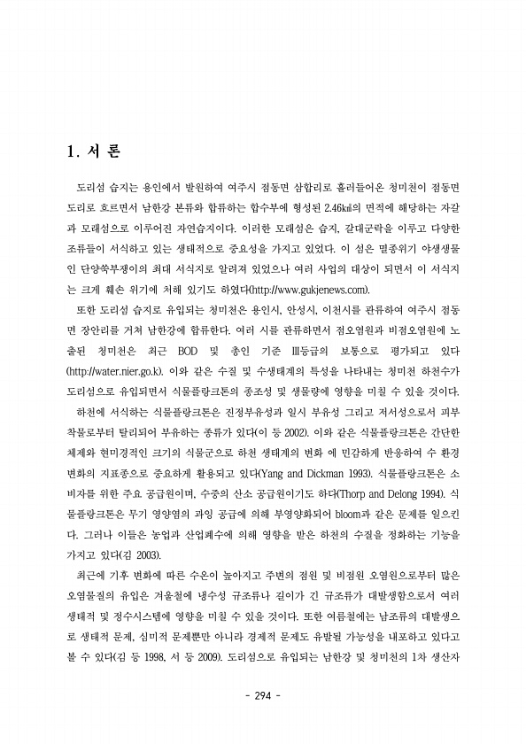 294 도리섬 습지는 용인에서 발원하여 여주시 점동면 삼합리로 흘러들어온 청미천이 점동면 도리로 흐르면서 남한강 본류와 합류하는 합수부에 형성된 의 면적에 해당하는 자갈 2.46㎢ 과 모래섬으로 이루어진 자연습지이다 이러한 모래섬은 습지 갈대군락을 이루고 다양한 , 조류들이 서식하고 있는 생태적으로 중요성을 가지고 있었다 이 섬은 멸종위기 야생생물 인 단양쑥부쟁이의 최대 서식지로 알려져 있었으나 여러 사업의 대상이 되면서 이 서식지 는 크게 훼손 위기에 처해 있기도 하였다 http//www.gukjenews.com 또한 도리섬 습지로 유입되는 청미천은 용인시 안성시 이천시를 관류하여 여주시 점동 , , 면 장안리를 거쳐 남한강에 합류한다 여러 시를 관류하면서 점오염원과 비점오염원에 노 출된 청미천은 최근 및...