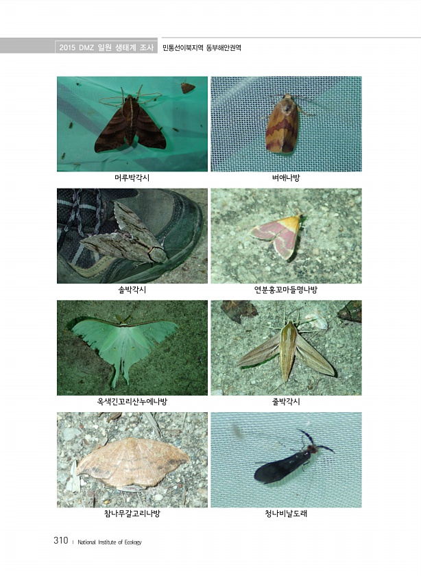 2015 DMZ 일원 생태계 조사 민통선이북지역 동부해안권역 310 ? National Institute of Ecology 머루박각시 벼애나방 솔박각시 연분홍꼬마들명나방 옥색긴꼬리산누에나방 줄박각시 참나무갈고리나방청나비날도래