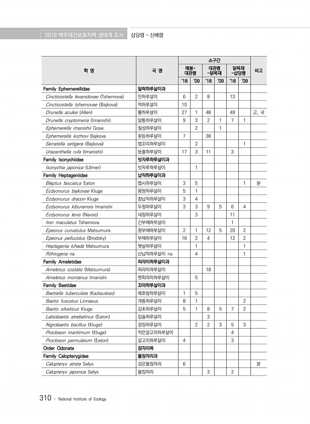 2018 백두대간보호지역 생태계 조사 삽당령 신배령 310 ? National Institute of Ecology 학 명 국 명 소구간 매봉비고 대관령 대관령 닭목재 닭목재 삽당령 ‘18 ‘09 ‘18 ‘09 ‘18 ‘09 Family Ephemerellidae 알락하루살이과 Cincticostella levanidovae Tshernova 민하루살이 6 2 8 13 Cincticostella tshernovae Bajkova 먹하루살이 10 Drunella aculea Allen 뿔하루살이 27 1 48 49 고, 국 Drunella cryptomeria Imanishi 알통하루살이 9 3 2 1 7 1 Ephemerella imanishii Gose 칠성하루살이 2 1 Ephemerella kozhov...