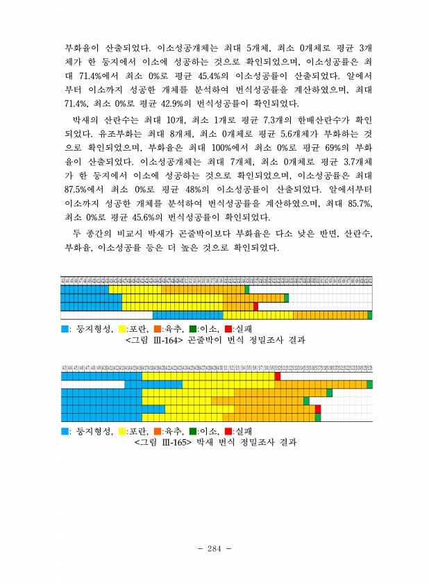 284 부화율이 산출되었다. 이소성공개체는 최대 5개체, 최소 0개체로 평균 3개 체가 한 둥지에서 이소에 성공하는 것으로 확인되었으며, 이소성공률은 최 대 71.4%에서 최소 0%로 평균 45.4%의 이소성공률이 산출되었다. 알에서 부터 이소까지 성공한 개체를 분석하여 번식성공률을 계산하였으며, 최대 71.4%, 최소 0%로 평균 42.9%의 번식성공률이 확인되었다. 박새의 산란수는 최대 10개, 최소 1개로 평균 7.3개의 한배산란수가 확인 되었다. 유조부화는 최대 8개체, 최소 0개체로 평균 5.6개체가 부화하는 것 으로 확인되었으며, 부화율은 최대 100%에서 최소 0%로 평균 69%의 부화 율이 산출되었다. 이소성공개체는 최대 7개체, 최소 0개체로 평균 3.7개체 가 한 둥지에서 이소에 성공하는 ...