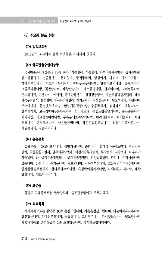 2018 DMZ 일원 생태계 조사 민통선이북지역 중부산악권역 310 ? National Institute of Ecology 3 주요종 분포 현황 가 법정보호종 2018년도 조사에서 법적 보호종은 조사되지 않았다. 나 국외반출승인대상종 국외반출승인대상종은 59종 홍다리사슴벌레, 사슴벌레, 다우리아사슴벌레, 톱사슴벌레, 등노랑풍뎅이, 별줄풍뎅이, 톱하늘소, 왕귀뚜라미, 땅강아지, 파리매, 애사마귀붙이, 까마귀부전나비, 긴꼬리산누에나방, 참나무산누에나방, 달유리고치나방, 숲재주나방, 그물무늬창나방, 꽃팔랑나비, 대왕팔랑나비, 개오동명나방, 산제비나비, 꼬리명주나비, 멧노랑나비, 기생나비, 애매미, 줄우단풍뎅이, 참검정풍뎅이, 가는조롱박먼지벌레, 네점 가슴무당벌레, 물땡땡이, 대유동방아벌레, 쐐기풀나비, 참산뱀눈...