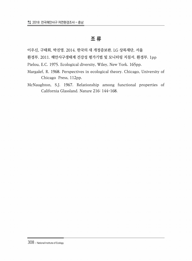 2018 전국해안사구 자연환경조사 충남 308 ? National Institute of Ecology 이우신, 구태회, 박진영. 2014. 한국의 새 개정증보판. LG 상록재단, 서울 환경부. 2011. 해안사구생태계 건강성 평가기법 및 모니터링 지침서. 환경부. 1pp Pielou, E.C. 1975. Ecological diversity, Wiley, New York. 165pp. Margalef, R. 1968. Perspectives in ecological theory. Chicago, University of Chicago Press, 112pp. McNaughton, S.J. 1967. Relationship among functional properties of California Glass...