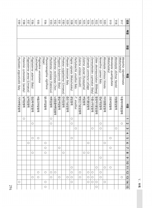Ⅴ. 부록 294 번호 목명 과명 학명 국명 1 2 3 4 5 6 7 8 9 10 11 12 13 14 15 917 Medythia nigrobilineata Motschulsky 두줄박이애잎벌레 ○ ○ 918 Monolepta dichroa Harold 외발톱잎벌레 ○ 919 Monolepta quadriguttata Motschulsky 크로바잎벌레 ○ ○ ○ 920 Monolepta shirozui Kimoto 어리발톱잎벌레 ○ ○ ○ 921 Nonarthra cyanea Baly 점날개잎벌레 ○ ○ ○ ○ ○ 922 Oides decempunctatus Billberg 열점박이별잎벌레 ○ ○ ○ 923 Oomorphoides cupreatus Baly 두릅나무잎벌레 ○ ○ ○ ○ 924 Ophrael...