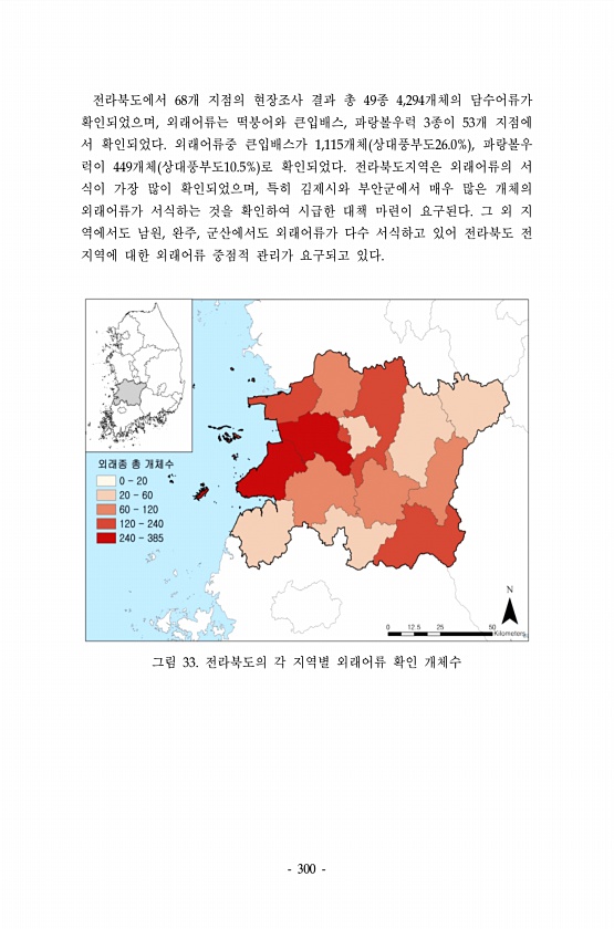 300 전라북도에서 68개 지점의 현장조사 결과 총 49종 4,294개체의 담수어류가 확인되었으며, 외래어류는 떡붕어와 큰입배스, 파랑볼우럭 3종이 53개 지점에 서 확인되었다. 외래어류중 큰입배스가 1,115개체 상대풍부도26.0% , 파랑볼우 럭이 449개체 상대풍부도10.5% 로 확인되었다. 전라북도지역은 외래어류의 서 식이 가장 많이 확인되었으며, 특히 김제시와 부안군에서 매우 많은 개체의 외래어류가 서식하는 것을 확인하여 시급한 대책 마련이 요구된다. 그 외 지 역에서도 남원, 완주, 군산에서도 외래어류가 다수 서식하고 있어 전라북도 전 지역에 대한 외래어류 중점적 관리가 요구되고 있다. 그림 33. 전라북도의 각 지역별 외래어류 확인개체수