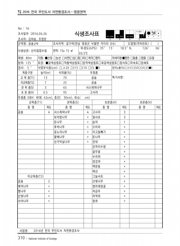 2016 전국 무인도서 자연환경조사 영광권역 310 ? National Institute of Ecology No 16 조사일자 2016.04.26 조사자김하송, 조영준 식생조사표 군락명곰솔군락 조사지역갈구여 전남 영광군 낙월면 각이리 산4 도엽명 격자번호 식생상관산지침엽수림 면적15x 15 ㎡ 위?경도 GPS 35° 15′ 18.5″N, 126° 06′ 03.5E 해발80m 지형■산정 □능선 □사면 □상□중□하 □계곡□평지 미세지형■평면 □돌출 □함몰 □요철 방위125 ° 토양■갈색삼림토□적황색삼림토□암적색삼림토□회갈색삼림토□침식토□미숙토□암쇄토 경사5 ° 낙엽부식층 cm □.≥20 □ 15 □ 10 □ 5 ■0 암석노출 % □≥51□ 50□ 25□ 5■0 계층구분 높이 m 식피율 % 우점종 교 목 층 T...