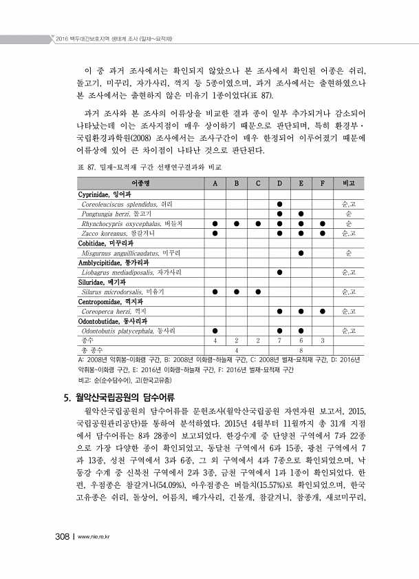 2016 백두대간보호지역 생태계 조사 밀재묘적재 308Ⅰwww.nie.re.kr 이 중 과거 조사에서는 확인되지 않았으나 본 조사에서 확인된 어종은 쉬리, 돌고기, 미꾸리, 자가사리, 꺽지 등 5종이였으며, 과거 조사에서는 출현하였으나 본 조사에서는 출현하지 않은 미유기 1종이었다 표 87 과거 조사와 본 조사의 어류상을 비교한 결과 종이 일부 추가되거나 감소되어 나타났는데 이는 조사지점이 매우 상이하기 때문으로 판단되며, 특히 환경부· 국립환경과학원 2008 조사에서는 조사구간이 매우 한정되어 이루어졌기 때문에 어류상에 있어 큰 차이점이 나타난 것으로 판단된다. 어종명 A B C D E F 비고 Cyprinidae, 잉어과 Coreoleuciscus splendidus, 쉬리 ● 순,고 Pungtungia...