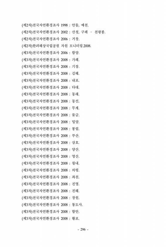 제2차 전국자연환경조사 1998 안동, 예천. 제2차 전국자연환경조사 2002 산청, 구례 ? 천왕봉. 제2차 전국자연환경조사 2006 거창. 제2차 한려해상국립공원 자원 모니터링.2008. 제3차 전국자연환경조사 2006 함양. 제3차 전국자연환경조사 2008 가례. 제3차 전국자연환경조사 2008 기장. 제3차 전국자연환경조사 2008 김해. 제3차 전국자연환경조사 2008 내포. 제3차 전국자연환경조사 2008 다대. 제3차 전국자연환경조사 2008 동래. 제3차 전국자연환경조사 2008 동선. 제3차 전국자연환경조사 2008 무계. 제3차 전국자연환경조사 2008 물금. 제3차 전국자연환경조사 2008 밀양. 제3차 전국자연환경조사 2008 봉림. 제3차 전국자연환경조사 2008 부산. 제3차 전국자...
