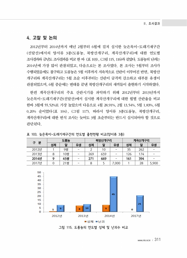 Ⅱ. 조사결과 www.nie.re.kr ? 311 4. 고찰 및 논의 2012년부터 2014년까지 매년 2월부터 6월에 걸쳐 실시한 늦은목이도래기재구간 선달산 에서의 양서류 3종 도롱뇽, 북방산개구리, 계곡산개구리 에 대한 연도별 조사결과와 금년도 조사결과를 비교 한 바 표 103 , 그림 115, 116 과 같았다. 도롱뇽의 난괴는 2014년에 가장 많이 관찰되었고, 다음으로는 본 조사였다. 본 조사는 5월부터 조사가 수행되었음에도 불구하고 도롱뇽은 5월 이후까지 지속적으로 산란이 이루어진 반면, 북방산 개구리와 계곡산개구리는 5월 초순 이후부터는 산란이 급격히 감소하고 대부분 유생이 관찰되었으며, 6월 중순에는 변태를 끝낸 북방산개구리의 새끼들이 출현하기 시작하였다. 한편 계곡산개구리의 주요 산란시기를 ...