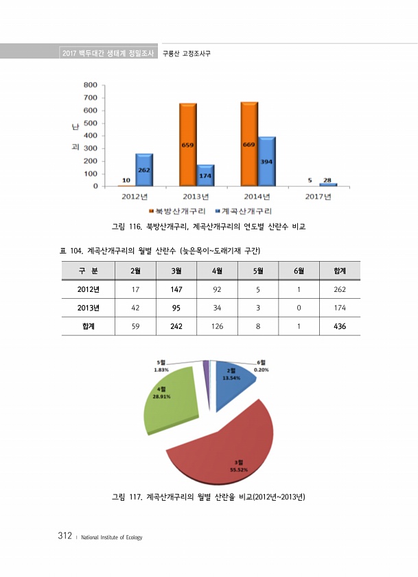 2017 백두대간 생태계 정밀조사 구룡산 고정조사구 312 ? National Institute of Ecology 그림 116. 북방산개구리, 계곡산개구리의 연도별 산란수 비교 표 104. 계곡산개구리의 월별 산란수 늦은목이도래기재 구간 구 분 2월 3월 4월 5월 6월 합계 2012년 17 147 92 5 1 262 2013년 42 95 34 3 0 174 합계 59 242 126 8 1 436 그림 117. 계곡산개구리의 월별 산란율 비교 2012년2013년