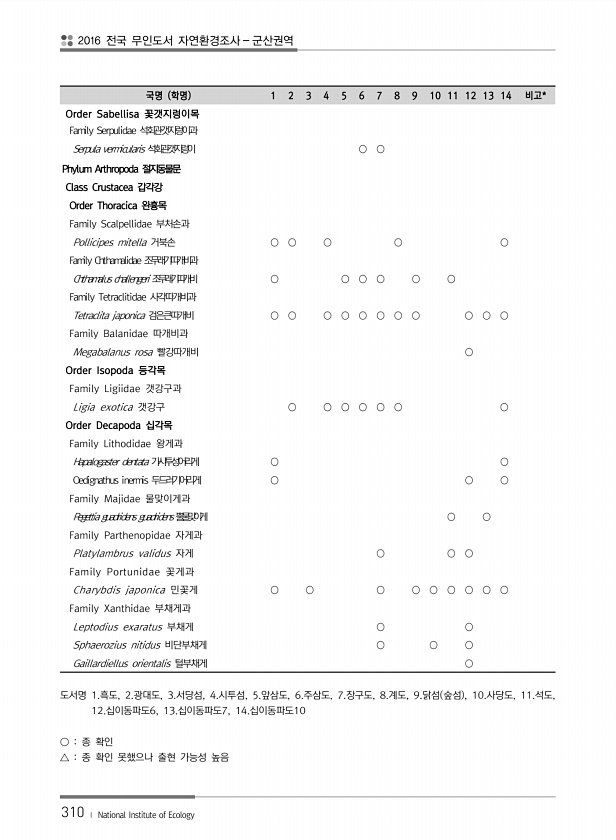 2016 전국 무인도서 자연환경조사 군산권역 310 ? National Institute of Ecology 국명 학명 1 2 3 4 5 6 7 8 9 10 11 12 13 14 비고* Order Sabellisa 꽃갯지렁이목 Family Serpulidae 석회관갯지렁이과 Serpula vermicularis 석회관갯지렁이 ○ ○ Phylum Arthropoda 절지동물문 Class Crustacea 갑각강 Order Thoracica 완흉목 Family Scalpellidae 부처손과 Pollicipes mitella 거북손 ○ ○ ○ ○ ○ Family Chthamalidae 조무래기따개비과 Chthamalus challengeri 조무래기따개비 ○ ○ ○ ○ ○ ○ Family Tetraclitida...