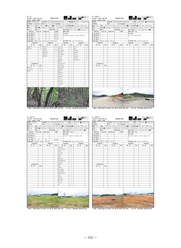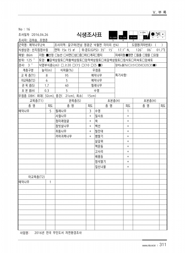 Ⅴ. 부 록 www.nie.re.kr ? 311 No 16 조사일자 2016.04.26 조사자김하송, 조영준 식생조사표 군락명예덕나무군락 조사지역갈구여 전남 영광군 낙월면 각이리 산4 도엽명 격자번호 식생상관산지침엽수림 면적15x 15 ㎡ 위?경도 GPS 35° 15′ 17.1″N, 126° 06′ 01.7E 해발86m 지형■산정 □능선 □사면 □상□중□하 □계곡□평지 미세지형■평면 □돌출 □함몰 □요철 방위125 ° 토양■갈색삼림토□적황색삼림토□암적색삼림토□회갈색삼림토□침식토□미숙토□암쇄토 경사3 ° 낙엽부식층 cm □.≥20 □ 15 □ 10 □ 5 ■0 암석노출 % □≥51□ 50□ 25□ 5■0 계층구분 높이 m 식피율 % 우점종 교 목 층 T1 8 95 예덕나무 특기사항아교목층 T2 6 5 예덕나무...