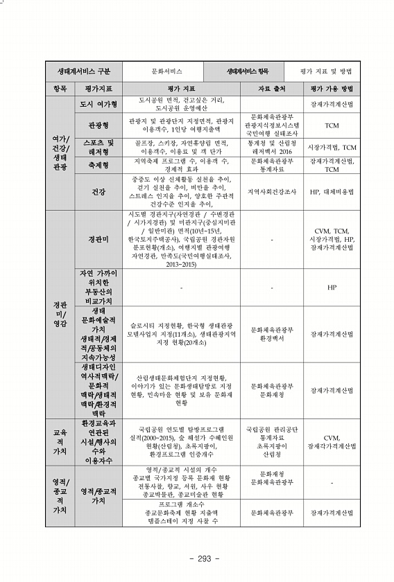 293 생태계서비스 구분 문화서비스 생태계서비스 항목 평가 지표 및 방법 항목 평가지표 평가 지표 자료 출처 평가 가용 방법 여가/ 건강/ 생태 관광 도시 여가형 도시공원 면적, 걷고싶은 거리, 도시공원 운영예산 잠재가격계산법 관광형 관광지 및 관광단지 지정면적, 관광지 이용객수, 1인당 여행지출액 문화체육관광부 관광지식정보시스템 국민여행 실태조사 TCM 스포츠 및 레저형 골프장, 스키장, 자연휴양림 면적, 이용객수, 이용료 및 객 단가 통계청 및 산림청 레저백서 2016 시장가격법, TCM 축제형 지역축제 프로그램 수, 이용객 수, 경제적 효과 문화체육관광부 통계자료 잠재가격계산법, TCM 건강 중증도 이상 신체활동 실천율 추이, 걷기 실천율 추이, 비만율 추이, 스트레스 인지율 추이, 양호한 주관적 건강...