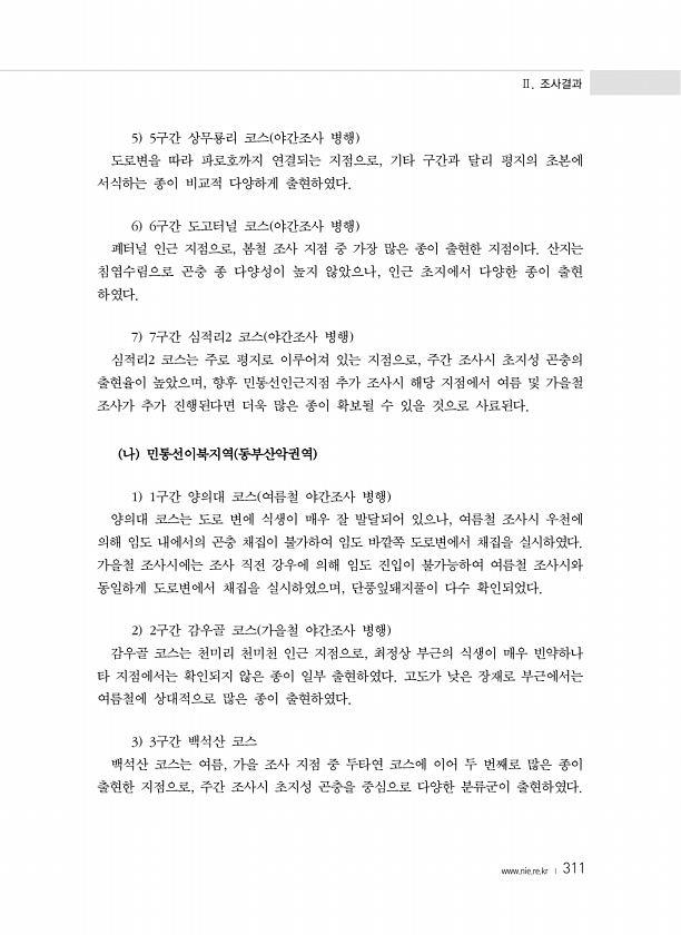 Ⅱ. 조사결과 www.nie.re.kr ? 311 5 5구간 상무룡리 코스 야간조사 병행 도로변을 따라 파로호까지 연결되는 지점으로, 기타 구간과 달리 평지의 초본에 서식하는 종이 비교적 다양하게 출현하였다. 6 6구간 도고터널 코스 야간조사 병행 폐터널 인근 지점으로, 봄철 조사 지점 중 가장 많은 종이 출현한 지점이다. 산지는 침엽수림으로 곤충 종 다양성이 높지 않았으나, 인근 초지에서 다양한 종이 출현 하였다. 7 7구간 심적리2 코스 야간조사 병행 심적리2 코스는 주로 평지로 이루어져 있는 지점으로, 주간 조사시 초지성 곤충의 출현율이 높았으며, 향후 민통선인근지점 추가 조사시 해당 지점에서 여름 및 가을철 조사가 추가 진행된다면 더욱 많은 종이 확보될 수 있을 것으로 사료된다. 나 민통선이북지역 동...