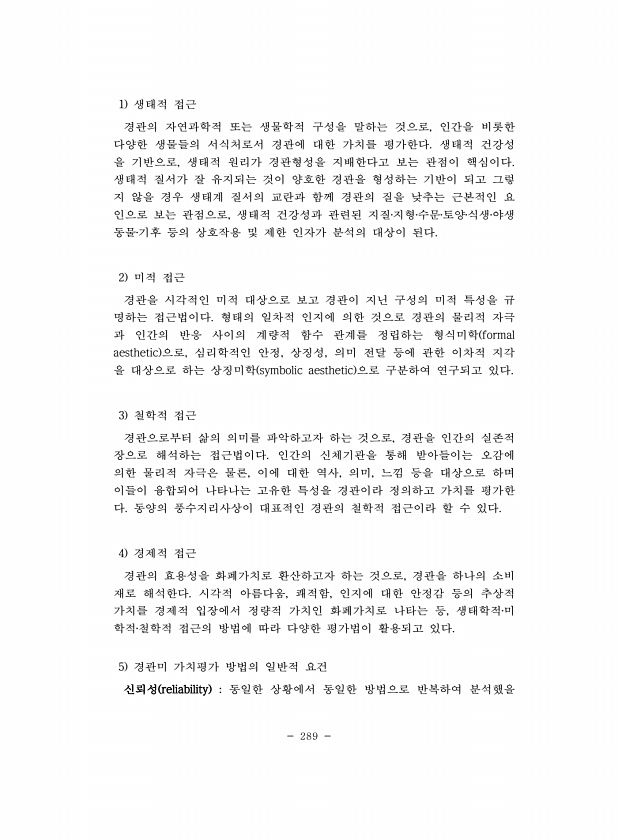 289 1 생태적 접근 경관의 자연과학적 또는 생물학적 구성을 말하는 것으로, 인간을 비롯한 다양한 생물들의 서식처로서 경관에 대한 가치를 평가한다. 생태적 건강성 을 기반으로, 생태적 원리가 경관형성을 지배한다고 보는 관점이 핵심이다. 생태적 질서가 잘 유지되는 것이 양호한 경관을 형성하는 기반이 되고 그렇 지 않을 경우 생태계 질서의 교란과 함께 경관의 질을 낮추는 근본적인 요 인으로 보는 관점으로, 생태적 건강성과 관련된 지질?지형?수문?토양?식생?야생 동물?기후 등의 상호작용 및 제한 인자가 분석의 대상이 된다. 2 미적 접근 경관을 시각적인 미적 대상으로 보고 경관이 지닌 구성의 미적 특성을 규 명하는 접근법이다. 형태의 일차적 인지에 의한 것으로 경관의 물리적 자극 과 인간의 반응 사이의 계량적 ...