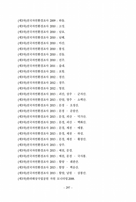 제3차 전국자연환경조사 2009 하동. 제3차 전국자연환경조사 2010 고성. 제3차 전국자연환경조사 2010 남포. 제3차 전국자연환경조사 2010 남해. 제3차 전국자연환경조사 2010 마산. 제3차 전국자연환경조사 2010 봉성. 제3차 전국자연환경조사 2010 진동. 제3차 전국자연환경조사 2010 진주. 제3차 전국자연환경조사 2011 읍내. 제3차 전국자연환경조사 2011 포항. 제3차 전국자연환경조사 2012 경산. 제3차 전국자연환경조사 2012 경주. 제3차 전국자연환경조사 2012 영천. 제3차 전국자연환경조사 2013 괴산, 상주 ? 군자산. 제3차 전국자연환경조사 2013 단양, 영주 ? 소백산. 제3차 전국자연환경조사 2013 문경 ? 오정산. 제3차 전국자연환경조사 2013 문경 ?...