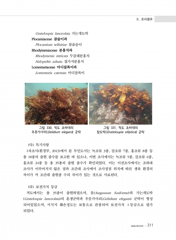 Ⅱ. 조사결과 www.nie.re.kr ? 311 Grateloupia lanceolata 가는개도박 Plocamiaceae 곱슬이과 Plocamium telfairiae 참곱슬이 Rhodymeniaceae 본홍치과 Rhodymenia intricata 두갈래분홍치 Halopeltis adnata 겹가지분홍치 Lomentariaceae 마디잘록이과 Lomentaria catenata 마디잘록이 그림 330. 적도 조하대의 우뭇가사리 Gelidium elegans 군락 그림 331. 적도 조하대의 참도박 Grateloupia elliptica 군락 다 특기사항 1차조사 환경부, 2013 에서 본 무인도서는 녹조류 3종, 갈조류 7종, 홍조류 8종 등 총 18종의 출현 종수를 보고한 바 있으나, 이번 조사에서는...