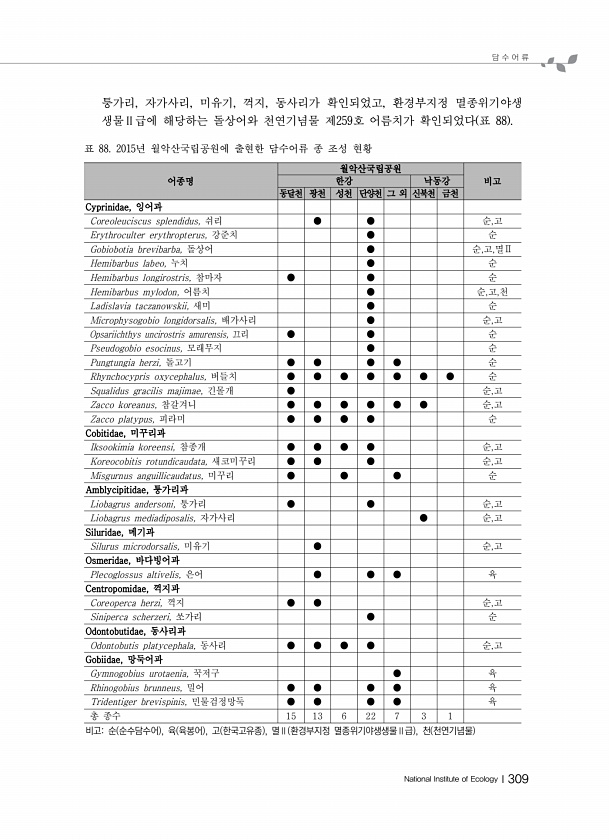 담 수 어 류 National Institute of EcologyⅠ309 퉁가리, 자가사리, 미유기, 꺽지, 동사리가 확인되었고, 환경부지정 멸종위기야생 생물Ⅱ급에 해당하는 돌상어와 천연기념물 제259호 어름치가 확인되었다 표 88 어종명 월악산국립공원 한강 낙동강 비고 동달천 광천 성천 단양천 그 외 신북천 금천 Cyprinidae, 잉어과 Coreoleuciscus splendidus, 쉬리 ● ● 순,고 Erythroculter erythropterus, 강준치 ● 순 Gobiobotia brevibarba, 돌상어 ● 순,고,멸Ⅱ Hemibarbus labeo, 누치 ● 순 Hemibarbus longirostris, 참마자 ● ● 순 Hemibarbus mylodon, 어름치 ● 순,고,천 Lad...