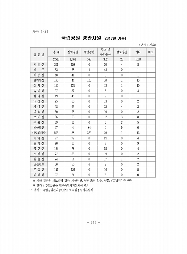959 [부록 4-2] 국립공원 경관자원 2017년 기준 단위 개소 공 원 별 총 계 산악경관 해양경관 문화유산 종교 및 향토경관 기타 비고 2,523 1,461 583 352 26 1018 지 리 산 201 159 0 30 4 8 경 주 83 38 1 43 0 1 계 룡 산 48 41 0 6 0 1 한려해상 190 44 120 10 1 15 설 악 산 155 131 0 13 1 10 속 리 산 97 87 0 6 0 4 한 라 산 49 46 0 2 0 1 내 장 산 75 60 0 13 0 2 가 야 산 98 63 0 28 4 3 덕 유 산 80 68 0 10 0 2 오 대 산 86 63 0 12 3 8 주 왕 산 69 56 0 6 2 5 태안해안 97 4 84 0 9 0 다도해해상 503 88 372 29 ...