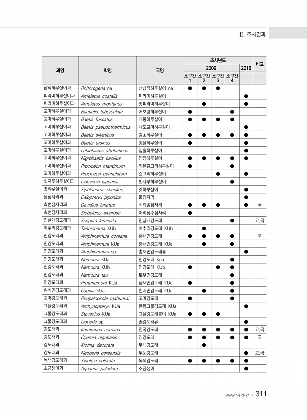 Ⅱ. 조사결과 www.nie.re.kr ? 311 과명 학명 국명 조사년도 비고 2009 2018 소구간 1 소구간 2 소구간 3 소구간 4 납작하루살이과 Rhithrogena na 산납작하루살이 na ● ● ● 피라미하루살이과 Ameletus costalis 피라미하루살이 ● 피라미하루살이과 Ameletus montanus 멧피라미하루살이 ● ● 꼬마하루살이과 Baetiella tuberculata 애호랑하루살이 ● ● 꼬마하루살이과 Baetis fuscatus 개똥하루살이 ● ● ● ● 꼬마하루살이과 Baetis pseudothermicus 나도꼬마하루살이 ● 꼬마하루살이과 Baetis silvaticus 감초하루살이 ● ● ● ● ● 꼬마하루살이과 Baetis ursinus 방울하루살이 ● ● 꼬마하루...