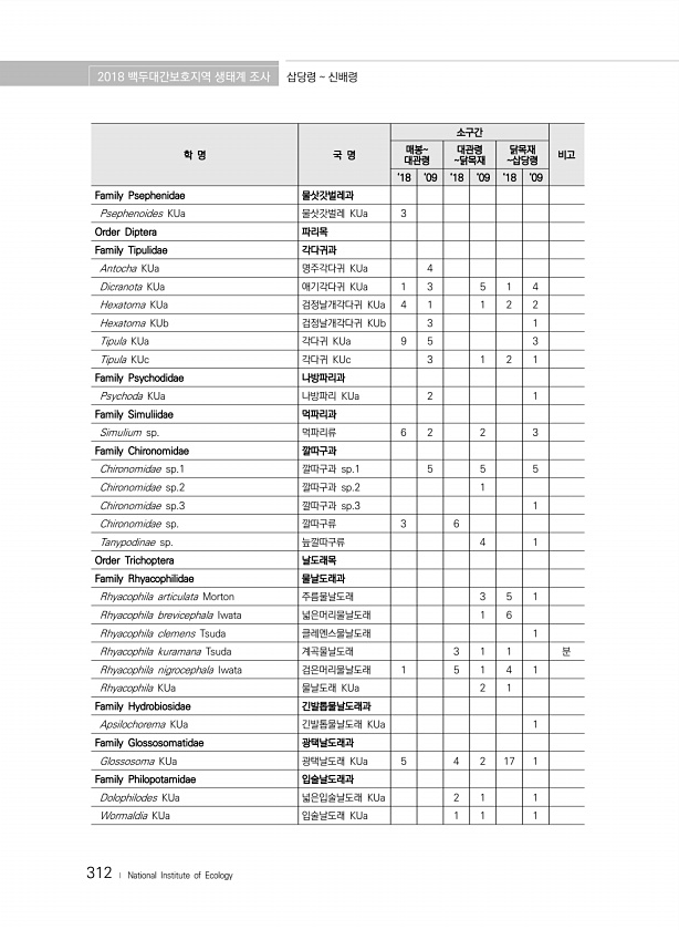 2018 백두대간보호지역 생태계 조사 댓재 삽당령 312 ? National Institute of Ecology 과명 학명 국명 조사년도 비고 2009 2018 소구간 1 소구간 2 소구간 3 소구간 4 뱀잠자리과 Parachauliodes continentalis 대륙뱀잠자리 ● 좀뱀잠자리과 Sialis KUa 좀뱀잠자리 KUa ● ● ● 좀뱀잠자리과 Sialis longidens 가는좀뱀잠자리 ● 알꽃벼룩과 Scirtidae sp. 알꽃벼룩류 ● ● 여울벌레과 Elmidae sp. 여울벌레류 ● ● 여울벌레과 Stenelmis sp. 긴다리여울벌레류 ● 물삿갓벌레과 Eubrianax KUa 둥근물삿갓벌레 KUa ● ● 물삿갓벌레과 Eubrianax ramicornis 둥근물삿갓벌레 ● 애기각다귀과 An...