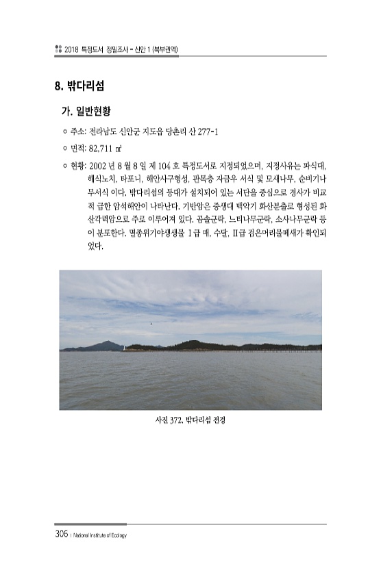 2018 특정도서 정밀조사 신안 1 북부권역 306 ? National Institute of Ecology 8. ? 주소전라남도 신안군 지도읍 당촌리 산 277-1 ? 면적82,711 ㎡ ? 현황2002 년 8 월 8 일 제 104 호 특정도서로 지정되었으며, 지정사유는 파식대, 해식노치, 타포니, 해안사구형성, 관목층 자금우 서식 및 모새나무, 순비기나 무서식 이다. 밖다리섬의 등대가 설치되어 있는 서단을 중심으로 경사가 비교 적 급한 암석해안이 나타난다. 기반암은 중생대 백악기 화산분출로 형성된 화 산각력암으로 주로 이루어져 있다. 곰솔군락, 느티나무군락, 소사나무군락 등 이 분포한다. 멸종위기야생생물 Ⅰ급 매, 수달, Ⅱ급 검은머리물떼새가 확인되 었다. 사진 372. 밖다리섬전경