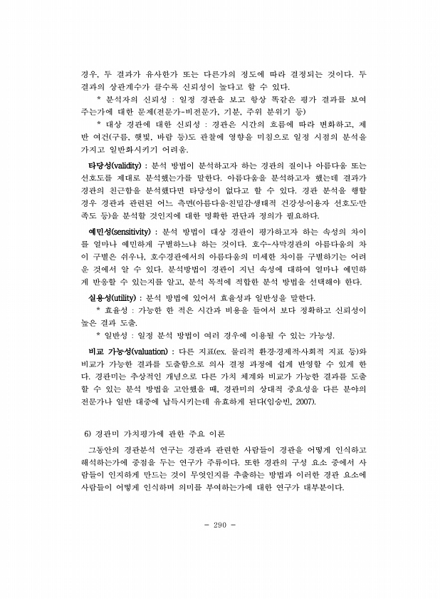 290 경우, 두 결과가 유사한가 또는 다른가의 정도에 따라 결정되는 것이다. 두 결과의 상관계수가 클수록 신뢰성이 높다고 할 수 있다. * 분석자의 신뢰성 일정 경관을 보고 항상 똑같은 평가 결과를 보여 주는가에 대한 문제 전문가-비전문가, 기분, 주위 분위기 등 * 대상 경관에 대한 신뢰성 경관은 시간의 흐름에 따라 변화하고, 제 반 여건 구름, 햇빛, 바람 등 도 관찰에 영향을 미침으로 일정 시점의 분석을 가지고 일반화시키기 어려움. 타당성 validity 분석 방법이 분석하고자 하는 경관의 질이나 아름다움 또는 선호도를 제대로 분석했는가를 말한다. 아름다움을 분석하고자 했는데 결과가 경관의 친근함을 분석했다면 타당성이 없다고 할 수 있다. 경관 분석을 행할 경우 경관과 관련된 어느 측면 아름다움?친밀...