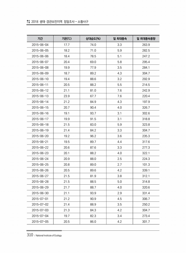 2018 생태·경관보전지역 정밀조사 소황사구 310 ? National Institute of Ecology 기간 기온 ℃ 상대습도 % 일 최대풍속 일 최대풍속풍향 2015-06-04 17.7 74.0 3.3 263.9 2015-06-05 18.2 71.0 5.9 282.5 2015-06-06 18.4 78.5 5.1 247.2 2015-06-07 20.4 69.0 5.8 295.4 2015-06-08 19.9 77.9 3.5 284.1 2015-06-09 18.7 89.2 4.3 304.7 2015-06-10 19.4 88.6 3.2 292.9 2015-06-11 20.5 88.2 5.5 214.5 2015-06-12 21.1 81.0 7.6 242.9 2015-06-13 23.9 67.7 7.6 220....