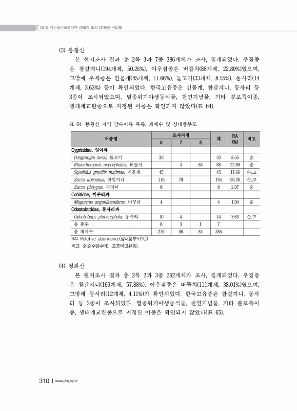 2016 백두대간보호지역 생태계 조사 추풍령밀재 310Ⅰwww.nie.re.kr 3 봉황산 본 현지조사 결과 총 2목 3과 7종 386개체가 조사, 집계되었다. 우점종 은 참갈겨니 194개체, 50.26% , 아우점종은 버들치 88개체, 22.80% 였으며, 그밖에 우세종은 긴몰개 45개체, 11.66% , 돌고기 33개체, 8.55% , 동사리 14 개체, 3.63% 등이 확인되었다. 한국고유종은 긴몰개, 참갈겨니, 동사리 등 3종이 조사되었으며, 멸종위기야생동식물, 천연기념물, 기타 분포특이종, 생태계교란종으로 지정된 어종은 확인되지 않았다 표 64 표 64. 봉황산 지역 담수어류 목록, 개체수 및 상대풍부도 어종명 조사지점 계 RA 6 7 8 % 비고 Cyprinidae, 잉어과 Pungtungia h...