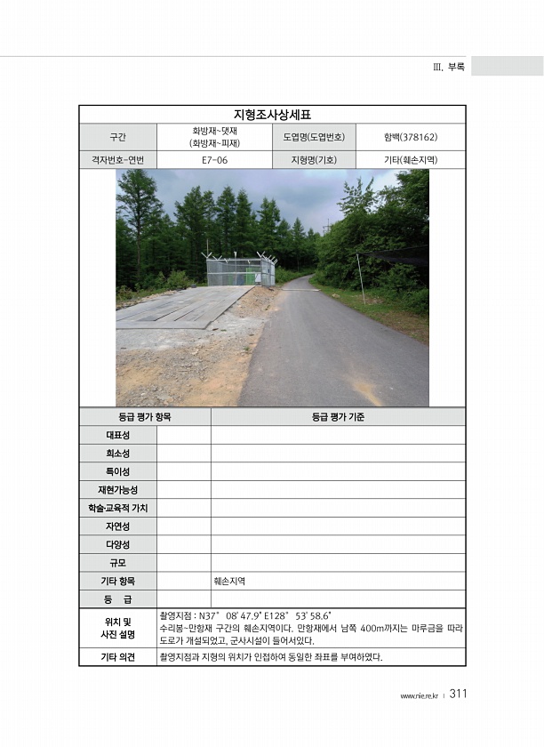 Ⅲ. 부록 www.nie.re.kr ? 311 지형조사상세표 구간 화방재댓재 화방재피재 도엽명 도엽번호 함백 378162 격자번호-연번 E7-06 지형명 기호 기타 훼손지역 등급 평가 항목 등급 평가 기준 대표성 희소성 특이성 재현가능성 학술?교육적 가치 자연성 다양성 규모 기타 항목 훼손지역 등 급 위치 및 사진 설명 촬영지점 N37° 0847.9E128° 5358.6수리봉만항재 구간의 훼손지역이다. 만항재에서 남쪽 400m까지는 마루금을 따라 도로가 개설되었고, 군사시설이 들어서있다. 기타 의견 촬영지점과 지형의 위치가 인접하여 동일한 좌표를부여하였다.