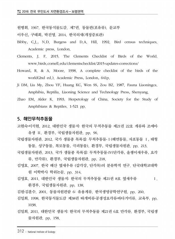 2016 전국 무인도서 자연환경조사 보령권역 312 ? National Institute of Ecology 원병휘. 1967. 한국동식물도감. 제7권. 동물편 포유류 문교부 이우신, 구태회, 박진영. 2014. 한국의새 개정증보관 Bibby, C.J., N.D. Burgess and D.A. Hill. 1992. Bird census techniques. Academic press. London. Clements. J. F. 2015. The Clements Checklist of Birds of the World. www.birds.cornell.edu/clementschecklist/2015-updates-corrections/ Howard, R. & A. Moore. 1998. A complete c...