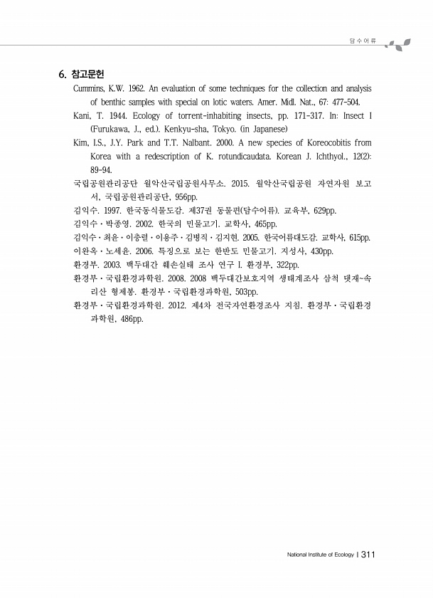 담 수 어 류 National Institute of EcologyⅠ311 6. 참고문헌 Cummins, K.W. 1962. An evaluation of some techniques for the collection and analysis of benthic samples with special on lotic waters. Amer. Midl. Nat., 67477-504. Kani, T. 1944. Ecology of torrent-inhabiting insects, pp. 171-317. InInsect I Furukawa, J., ed. Kenkyu-sha, Tokyo. in Japanese Kim, I.S., J.Y. Park and T.T. Nalbant. 2000. A new species o...