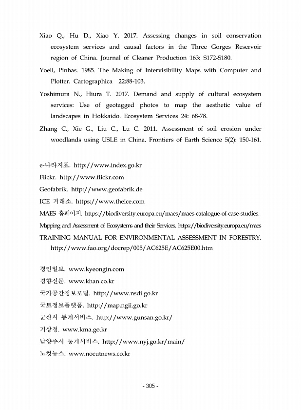 Xiao Q., Hu D., Xiao Y. 2017. Assessing changes in soil conservation ecosystem services and causal factors in the Three Gorges Reservoir region of China. Journal of Cleaner Production 163S172-S180. Yoeli, Pinhas. 1985. The Making of Intervisibility Maps with Computer and Plotter. Cartographica 2288-103. Yoshimura N., Hiura T. 2017. Demand and supply of cultural ecosystem servicesUse of geotagged p...