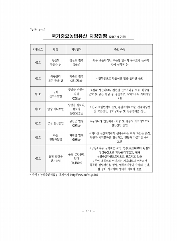 961 [부록 4-4] 국가중요농업유산 지정현황 2017. 6 기준 지정번호 명칭 지정범위 주요 특징 제1호 청산도 구들장 논 청산도 전역 5.0ha ?전통 온돌방식인 구들장 방식의 통수로가 논바닥 밑에 설치된 논 제2호 흑룡만리 제주 돌담 밭 제주도 전역 22,108km ?현무암으로 만들어진 밭을 둘러싼 돌담 제3호 구례 산수유농업 구례군 산동면 일원 228ha ?전국 생산의63%, 천년된 산수유나무 보유, 산수유 군락 및 낮은 돌담 등 경관우수, 지역고유의 재배기술 보유 제4호 담양 대나무밭 담양읍 삼다리, 향교리 일원 56.2ha ?전국 죽림면적의 26%, 경관적가치우수, 생물다양성 및 죽순생산, 농기구이용 및 전통죽제품 생산 제5호 금산 인삼농업 금산군 일원 297ha ?우리나라 인삼재배·가공 및 유...