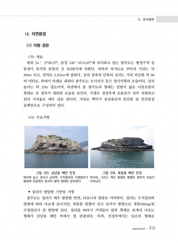 Ⅱ. 조사결과 www.nie.re.kr ? 313 나. 자연환경 1 지형?경관 가 개요 북위 34˚ 3708.07, 동경 128˚1614.87에 위치하고 있는 광주도는 행정구역 상 통영시 욕지면 동항리 산 202번지에 속한다. 북쪽의 욕지도로 부터의 거리는 약 300m 이고, 면적은 3,163㎡에 달한다. 섬의 장축과 단축의 길이는 거의 비슷한 약 80 여 미터로, 위에서 아래로 내려다 광주도는 모서리가 둥근 정사각형의 모습이다. 섬의 높이는 약 25m 정도이며, 측면에서 본 광주도의 형태는 밑변이 넓은 마름모꼴의 형태로 섬 정부가 평탄한 모습을 보인다. 식생은 정상부에 초본류가 일부 피복하고 있어 식피율은 매우 낮은 편이다. 지질은 백악기 유천층군의 안산암 및 안산암질 응회암으로 구성되어 있다. 나 주요지...