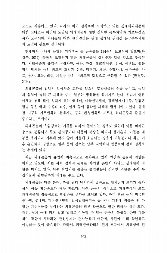 303 요소로 작용하고 있다. 따라서 이미 정착하여 서식하고 있는 생태계외래종에 대한 실태조사 이전에 도입된 외래생물에 대한 정확한 목록파악과 기초특성조 사가 요구되며, 외래종에 대한 관리결정을 위해 생태계 위해성 등급분류체계 의 도입이 필요한 실정이다. 현재까지 국내에 유입된 외래생물 중 곤충류는 134종이 보고되어 있으며 환 경부, 2014 , 목록의 포함되지 않은 외래곤충이 상당수가 있을 것으로 추측된 다. 외래곤충의 유입은 식량자원, 애완, 관상, 레크레이션, 전시, 이벤트, 생물 학적 방제용 등의 의도적 도입과 선박, 비행기, 차량, 수입자재, 농수산물, 사 료, 종자, 묘목, 태풍, 계절풍 등의 비의도적 도입으로 구분할 수 있다 환경부, 2014 외래곤충의 침입은 먹이사슬 교란을 일으켜 토착생물의...