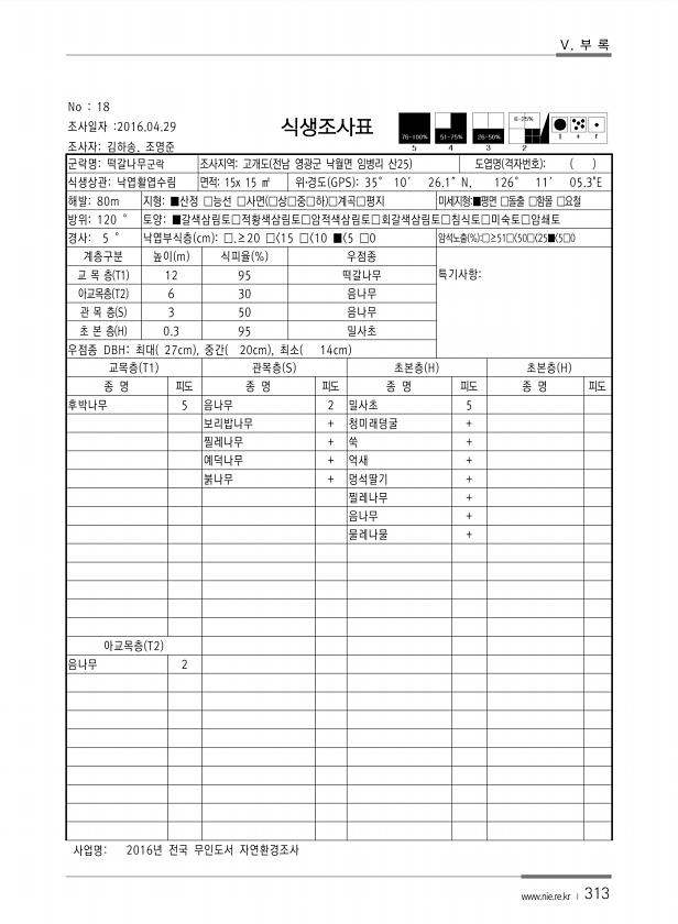 Ⅴ. 부 록 www.nie.re.kr ? 313 No 18 조사일자 2016.04.29 조사자김하송, 조영준 식생조사표 군락명떡갈나무군락 조사지역고개도 전남 영광군 낙월면 임병리 산25 도엽명 격자번호 식생상관낙엽활엽수림 면적15x 15 ㎡ 위?경도 GPS 35° 10′ 26.1″N, 126° 11′ 05.3E 해발80m 지형■산정 □능선 □사면 □상□중□하 □계곡□평지 미세지형■평면 □돌출 □함몰 □요철 방위120 ° 토양■갈색삼림토□적황색삼림토□암적색삼림토□회갈색삼림토□침식토□미숙토□암쇄토 경사5 ° 낙엽부식층 cm □.≥20 □ 15 □ 10 ■ 5 □0 암석노출 % □≥51□ 50□ 25■ 5□0 계층구분 높이 m 식피율 % 우점종 교 목 층 T1 12 95 떡갈나무 특기사항아교목층 T2 6 30 음...