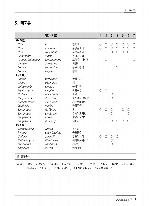 Ⅴ. 부 록 www.nie.re.kr ? 313 5. 해조류 학명 국명 1 2 3 4 5 6 7 녹조류 Ulva linza 잎파래 ○ ○ ○ ○ ○ ○ ○ Ulva australis 구멍갈파래 ○ ○ ○ ○ ○ ○ ○ Ulva conglobata 모란갈파래 ○ ○ ○ ○ ○ ○ ○ Cladophora albida 솜대마디말 Pseudocladophora conchopheria 고둥옷대마디말 ○ ○ Codium adhaerens 떡청각 Codium contractum 몽우리청각 ○ Codium fragile 청각 갈조류 Ralfsia verrucosa 바위딱지 Ishige okamurae 패 Colpomenia sinuosa 불레기말 Myelophycus simplex 바위수염 ○ ○ Undaria pinna...