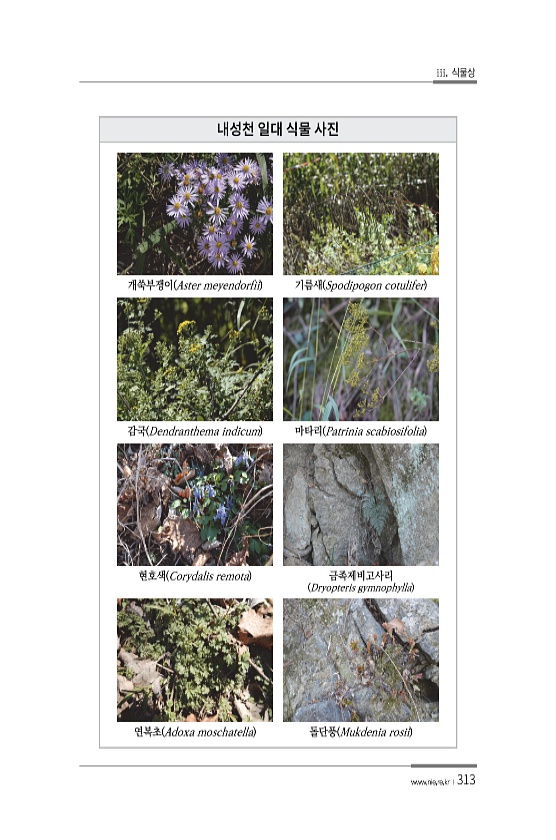 iii. 식물상 www.nie.re.kr ?313 개쑥부쟁이 Aster meyendorfii 기름새 Spodipogon cotulifer 감국 Dendranthema indicum 마타리 Patrinia scabiosifolia 현호색 Corydalis remota 금족제비고사리 Dryopteris gymnophylla 연복초 Adoxa moschatella 돌단풍 Mukdenia rosii