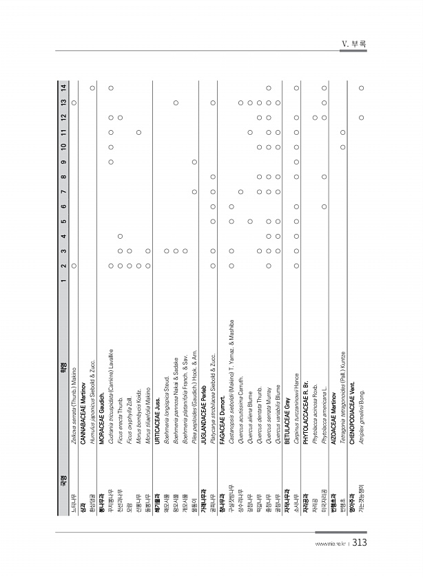 313 국명 학명 1 2 3 4 5 6 7 8 9 10 11 12 13 14 느티나무 Zelkova serrata Thunb. Makino ○ ○ 삼과 CANNABACEAE Martinov 환삼덩굴 Humulus japonicus Siebold & Zucc. ○ 뽕나무과 MORACEAE Gaudich. 꾸지뽕나무 Cudrania tricuspidata Carri?re Lavall?e ○ ○ ○ ○ ○ ○ 천선과나무 Ficus erecta Thunb. ○ ○ ○ ○ 모람 Ficus oxyphylla Zoll. ○ ○ 산뽕나무 Morus bombycis Koidz. ○ ○ 돌뽕나무 Morus tiliaefolia Makino ○ ○ 쐐기풀과 URTICACEAE Juss. 왜모시풀 Boehmeria longisp...