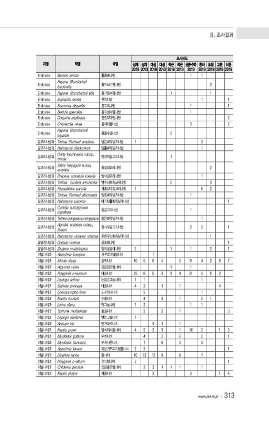 Ⅱ. 조사결과 www.nie.re.kr ? 313 과명 학명 국명 조사년도 성재 2018 성재 2013 대성 2018 대성 2013 적근 2018 적근 2013 산양+주파 2013 흰바 2013 도창 2018 고둔 2018 비운 2018 Erebidae Barsine striata 홍줄불나방 1 1 Erebidae Hypena Bonolocha bicoloralis 활무늬수염나방 2 Erebidae Hypena Bomolocha zilla 흰구름수염나방 1 1 Erebidae Euproctis similis 흰독나방 1 1 Erebidae Numenes disparilis 흰띠독나방 1 1 Erebidae Bertula spacoalis 흰띠쌍수염나방 1 Erebidae Corgatha argillacea ...