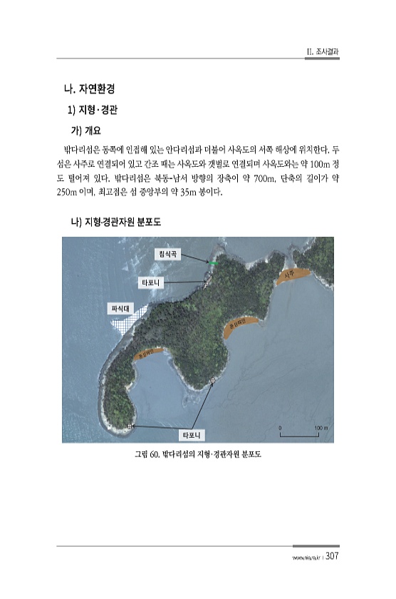 II. 조사결과 www.nie.re.kr ?307 1 · 밖다리섬은 동쪽에 인접해 있는 안다리섬과 더불어 사옥도의 서쪽 해상에 위치한다. 두 섬은 사주로 연결되어 있고 간조 때는 사옥도와 갯벌로 연결되며 사옥도와는 약 100m 정 도 떨어져 있다. 밖다리섬은 북동-남서 방향의 장축이 약 700m, 단축의 길이가 약 250m 이며, 최고점은 섬 중앙부의 약 35m 봉이다. ? 그림 60. 밖다리섬의 지형·경관자원분포도