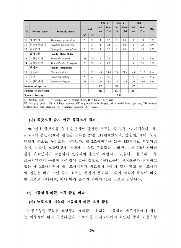 296 2019 37 231 1 27 212 , , , 2 29 133 , , , 2 2 1 1 , 2 Site 1 Site 2 Total No. Korean name Scientific name Guild Ind. ea Dom % Ind. ea Dom % Ind. ea Dom % Mig. N1 F2 31 Muscicapa griseisticta * GF 1 0.5 1 0.8 1 0.4 P.M. 31 Ficedula zanthopygia H GF 1 0.5 1 0.8 1 0.4 S.V. 32 Cyanoptila cyanomelana * GF 1 0.5 1 0.8 1 0.4 S.V. Family Motacillidae 33 Motacilla cinerea GS GF 2 0.9 2 0.9 Res. 34 Mota...