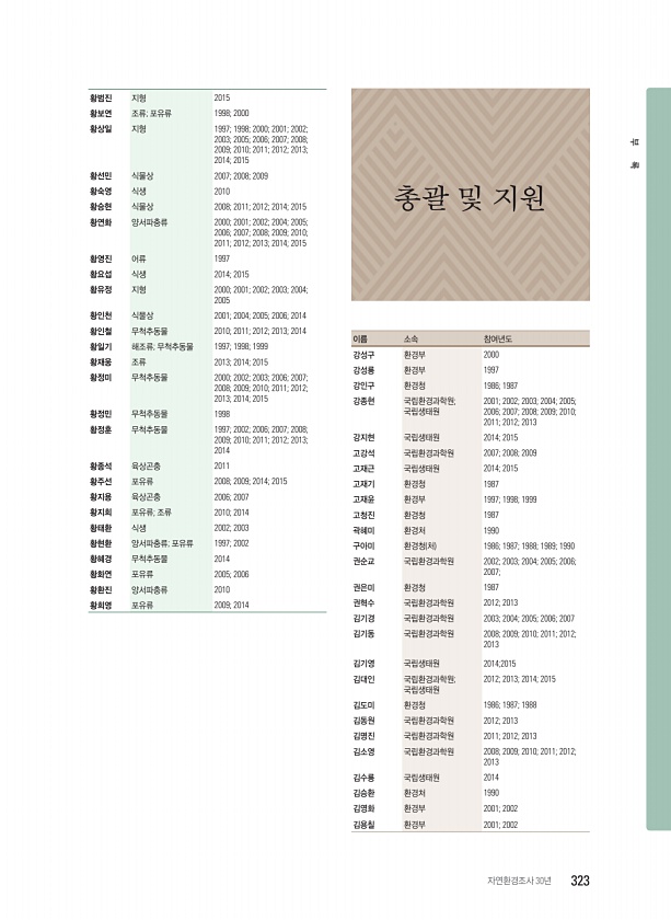 황범진 지형 2015 황보연 조류; 포유류 1998; 2000 황상일 지형 1997; 1998; 2000; 2001; 2002; 2003; 2005; 2006; 2007; 2008; 2009; 2010; 2011; 2012; 2013; 2014; 2015 황선민 식물상 2007; 2008; 2009 황숙영 식생 2010 황승현 식물상 2008; 2011; 2012; 2014; 2015 황연화 양서파충류 2000; 2001; 2002; 2004; 2005; 2006; 2007; 2008; 2009; 2010; 2011; 2012; 2013; 2014; 2015 황영진 어류 1997 황요섭 식생 2014; 2015 황유정 지형 2000; 2001; 2002; 2003; 2004; 2005 황인천 식물상 2001...