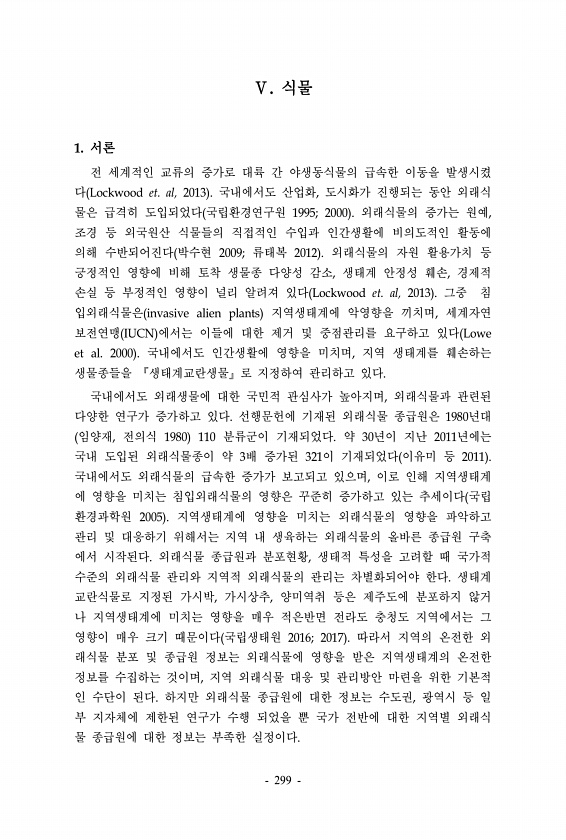 Ⅴ. 식물 1. 서론 전 세계적인 교류의 증가로 대륙 간 야생동식물의 급속한 이동을 발생시켰 다 Lockwood et. al, 2013 국내에서도 산업화, 도시화가 진행되는 동안 외래식 물은 급격히 도입되었다 국립환경연구원 1995; 2000 외래식물의 증가는 원예, 조경 등 외국원산 식물들의 직접적인 수입과 인간생활에 비의도적인 활동에 의해 수반되어진다 박수현 2009; 류태복 2012 외래식물의 자원 활용가치 등 긍정적인 영향에 비해 토착 생물종 다양성 감소, 생태계 안정성 훼손, 경제적 손실 등 부정적인 영향이 널리 알려져 있다 Lockwood et. al, 2013 그중 침 입외래식물은 invasive alien plants 지역생태계에 악영향을 끼치며, 세계자연 보전연맹 IUCN 에서는 이들에 대한...