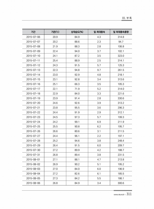 III. 부 록 www.nie.re.kr ?311 기간 기온 ℃ 상대습도 % 일 최대풍속 일 최대풍속풍향 2015-07-06 20.9 84.9 4.3 314.8 2015-07-07 20.2 88.6 2.3 94.7 2015-07-08 21.9 88.3 2.8 106.8 2015-07-09 22.4 94.0 3.7 102.1 2015-07-10 24.1 87.2 3.5 323.0 2015-07-11 25.4 88.9 2.5 314.1 2015-07-12 24.3 91.5 5.7 125.3 2015-07-13 22.3 94.8 9.7 261.5 2015-07-14 23.0 92.9 4.8 218.1 2015-07-15 23.1 92.8 3.4 313.6 2015-07-16 25.1 66.3 3.5 105.3 2...