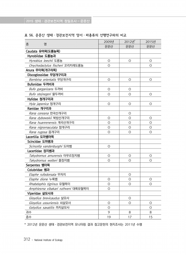 2015 생태·경관보전지역 정밀조사 운문산 312 ? National Institute of Ecology 표 56. 운문산 생태ㆍ경관보전지역 양서ㆍ파충류의 선행연구와의 비교 종 명 2009년 2012년* 2015년 운문산 운문산 운문산 Caudata 유미목 도롱뇽목 Hynobiidae 도롱뇽과 Hynobius leechii 도롱뇽 O O O Onychodactylus fischeri 꼬리치레도롱뇽 O O Anura 무미목 개구리목 Discoglossidae 무당개구리과 Bombina orientalis 무당개구리 O O O Bufonidae 두꺼비과 Bufo gargarizans 두꺼비 O O Bufo stejnegeri 물두꺼비 O O O Hylidae 청개구리과 Hyla japonica 청개구리 O O...