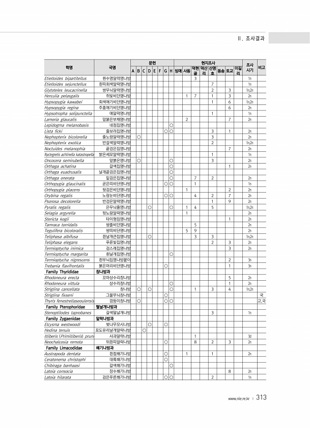 Ⅱ. 조사결과 www.nie.re.kr ? 313 학명 국명 문헌 현지조사 조사 A B C D E F G H 빙애 사동 덕현 시기 비고 골 덕산 리 산명 호 동송 토교 이길 리 Etielloides bipartitellus 흰수염알락명나방 3 1n Etielloides sejunctellus 흰띠회색알락명나방 7 1n Glytoteles leucacrinella 쌍무늬알락명나방 2 3 1n,2n Herculia pelasgalis 쥐빛비단명나방 1 7 1 3 2n Hypsopygia kawabei 회색애기비단명나방 1 6 1n,2n Hypsopygia regina 주홍애기비단명나방 6 2n Hypsotropha solipunctella 애알락명나방 1 1n Lamoria glaucalis 앞붉은부채명나방 2...